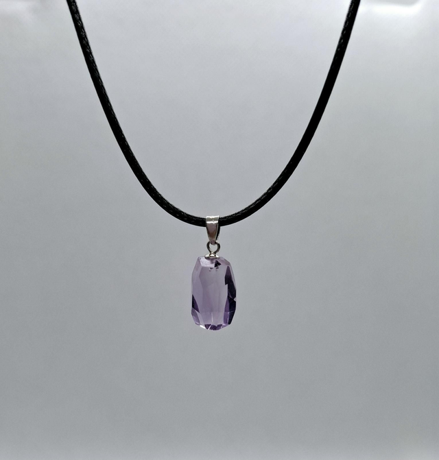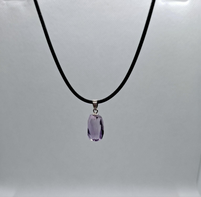 Pretty amethyst drop pendant. I can send with black cord or a silver plated chain. Both are 18 inches.