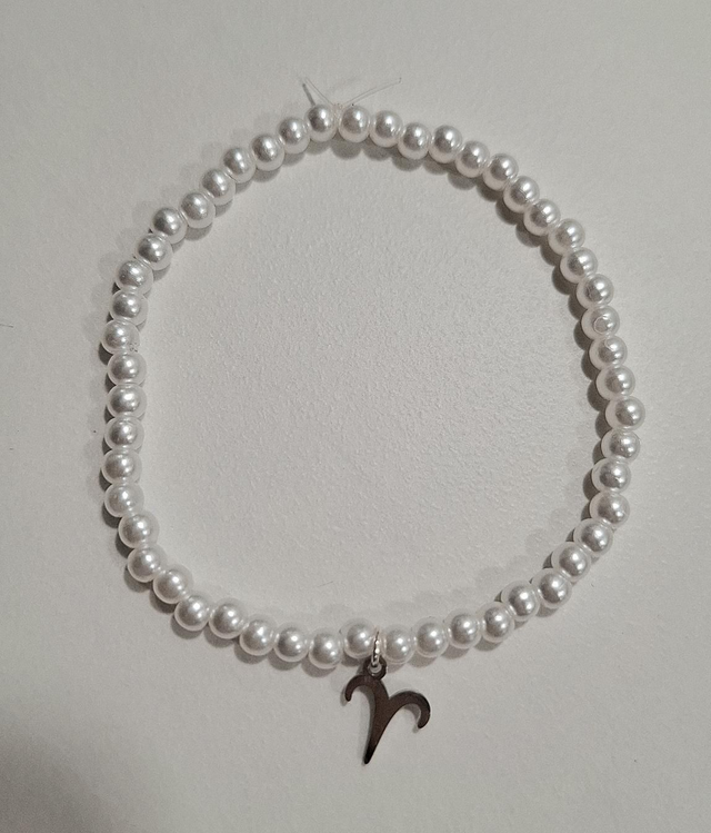 Dainty zodiac bracelet with small pearl white acrylic beads and silver metal zodiac charm. 17 cm and elasticated.