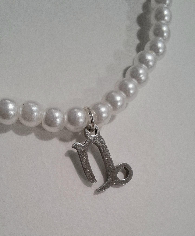 Dainty zodiac bracelet with small pearl white acrylic beads and silver metal zodiac charm. 17cm and elasticated.