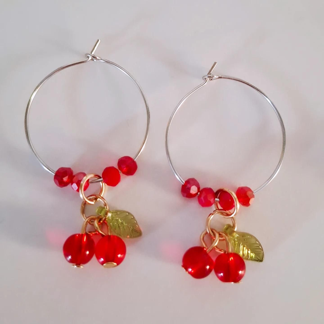 Silver tone (metal) hoop earrings with cute little cherries.