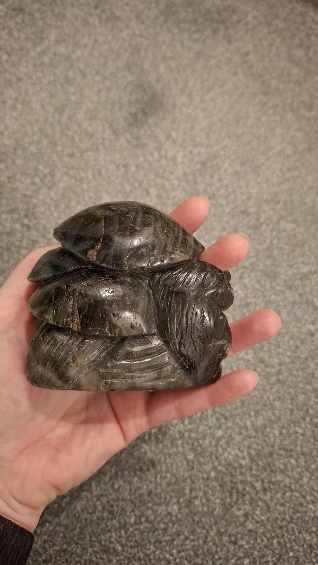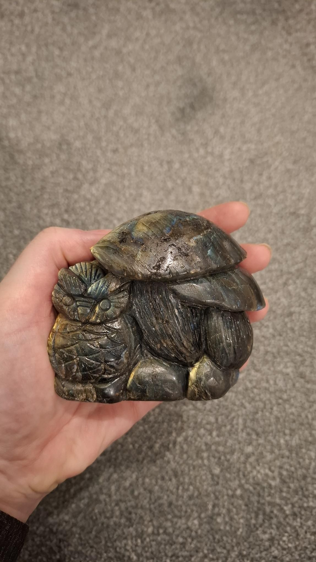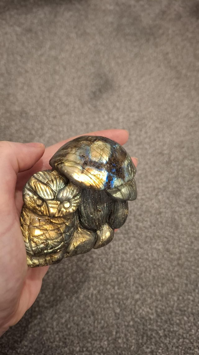 Labradorite Owl and Mushrooms carving. 8.5x7.5cm with beautiful gold and multicoloured flashes.