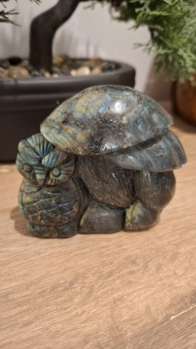 Labradorite Owl and Mushrooms crystal carving