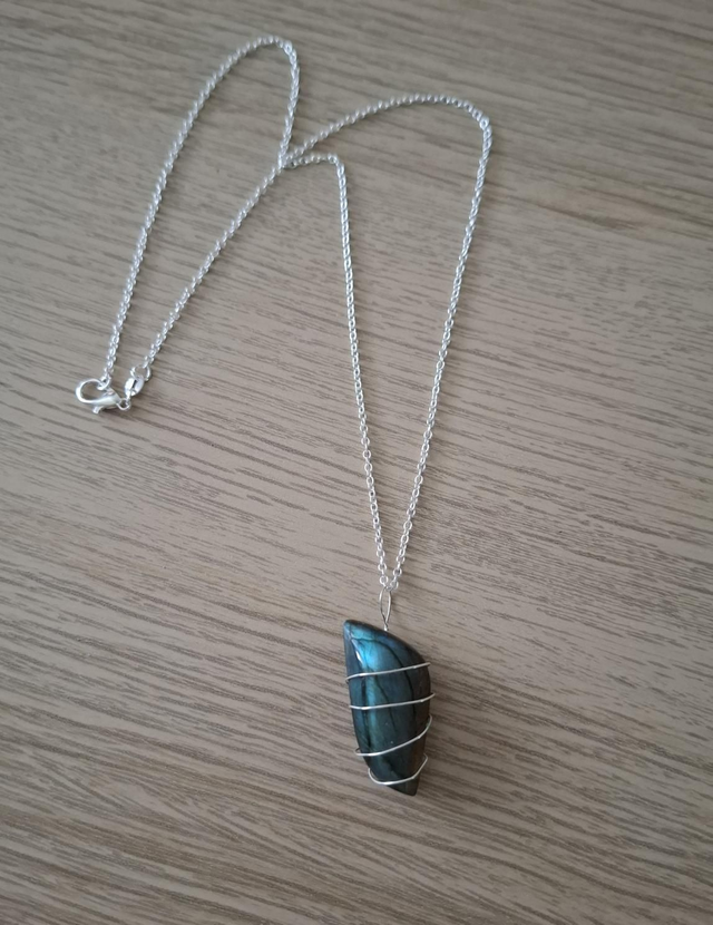 Labradorite pendant wrapped with silver tone wire. Comes with an 18inch silver plated chain.
