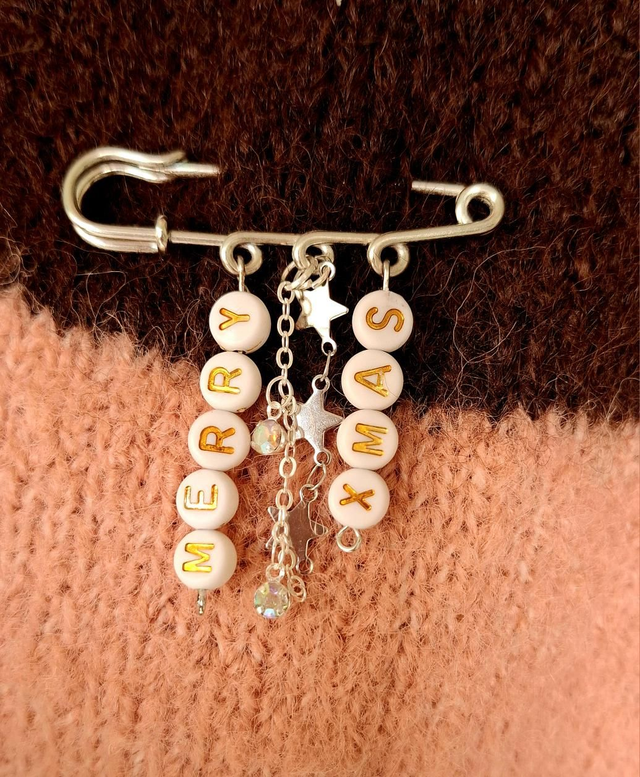 Silver metal brooch pin with Merry Xmas beads and star and diamante details. Can be worn as a brooch or scarf pin or bag charm, the choice is yours! Designed and assembled by me!