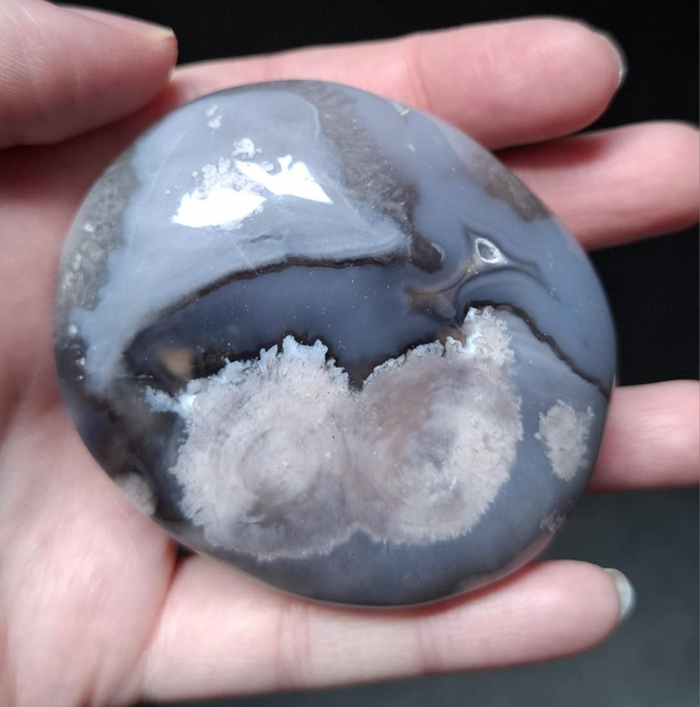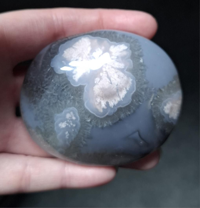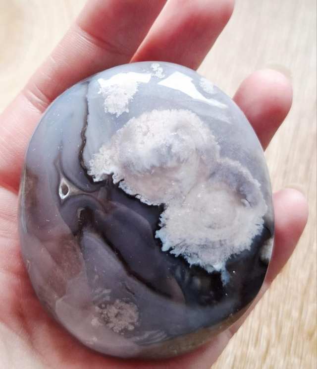 Moss Agate Blue Flower Agate mix large crystal palmstone. An unusual high quality palmstone combining both moss and blue flower agate. Large size and fully polished. 6.5 x 5.5cm
