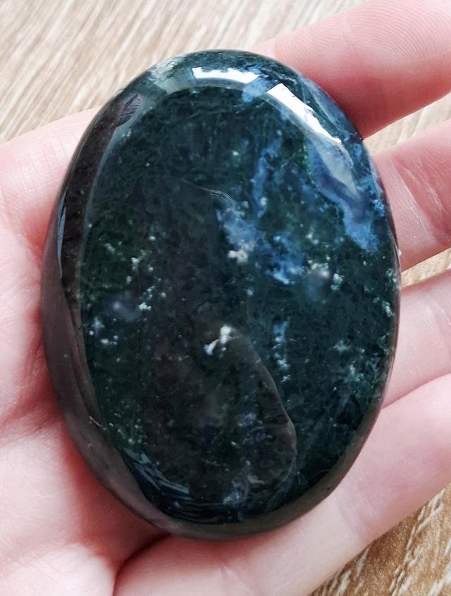 Polished moss agate palmstone as seen in photo.