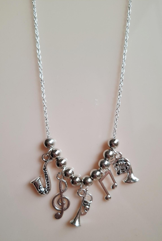 Handmade jazz themed charm necklace with 18 inch silver plated chain. charms are metal and beads are 6mm acrylic.