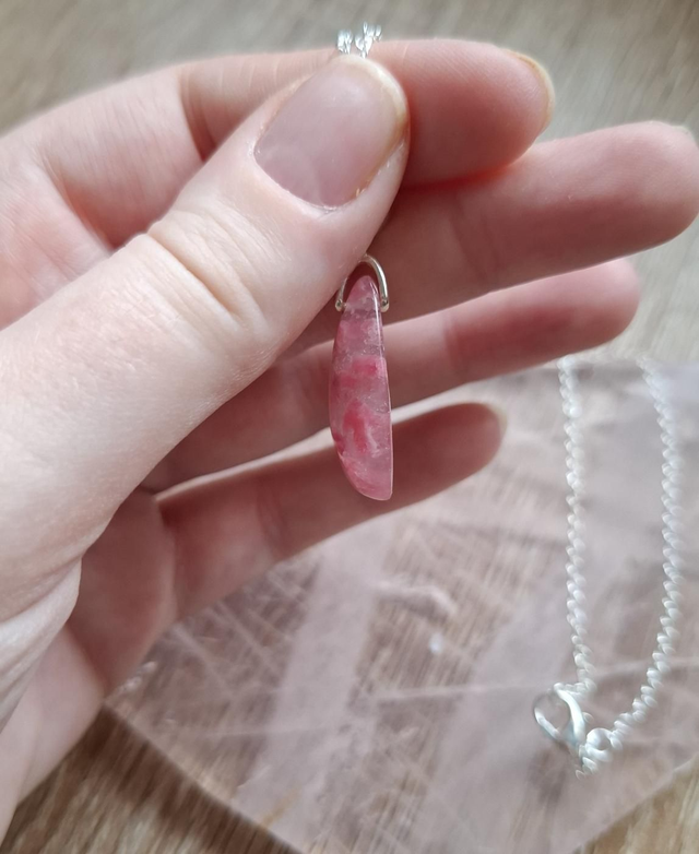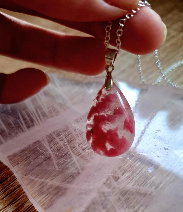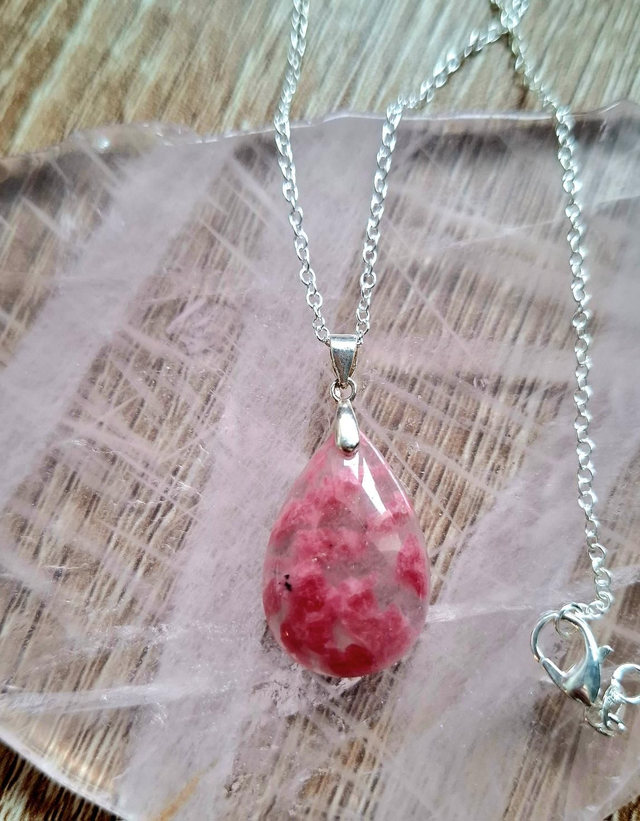Pretty rhodonite teardrop pendant with 925 silver hook and 18 inch silver plated chain.
