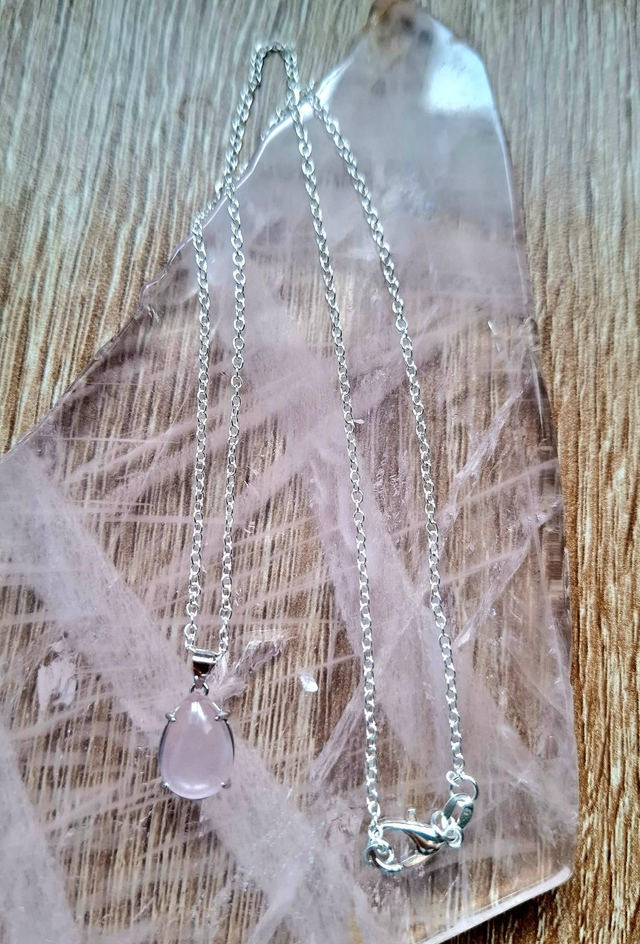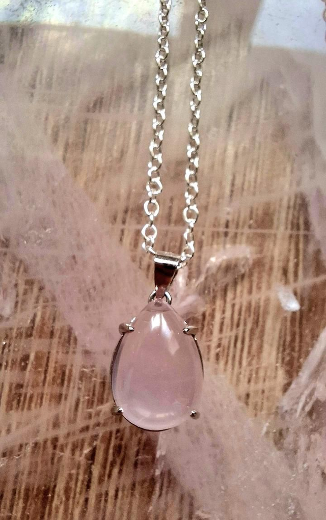 Pretty Rose Quartz teardrop pendant set in 925 silver. Subtle rainbow flash. Comes with an 18 inch silver plated chain.