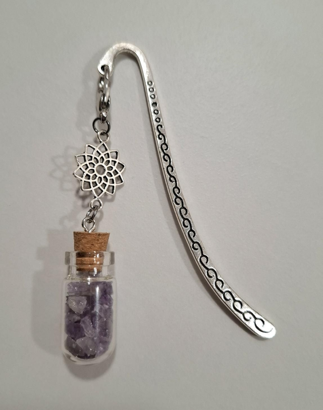 Silver lightweight metal bookmark mark with detachable mini jar of amethyst chips. Great gifts for book lovers. I have other bookmarks listed.