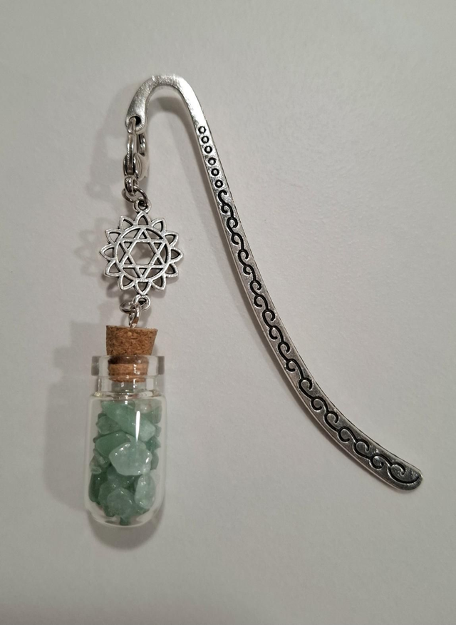 Silver lightweight metal bookmark mark with detachable mini jar of green aventurine chips. Great gifts for book lovers. I have other bookmarks listed.