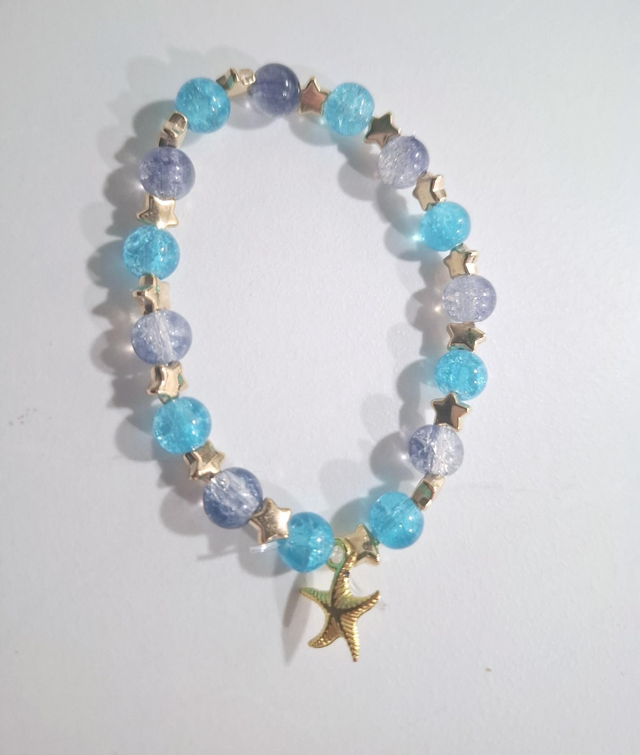 Pretty summer bracelets with gold tone starfish charm. 8mm beads. 17cm and elasticated.